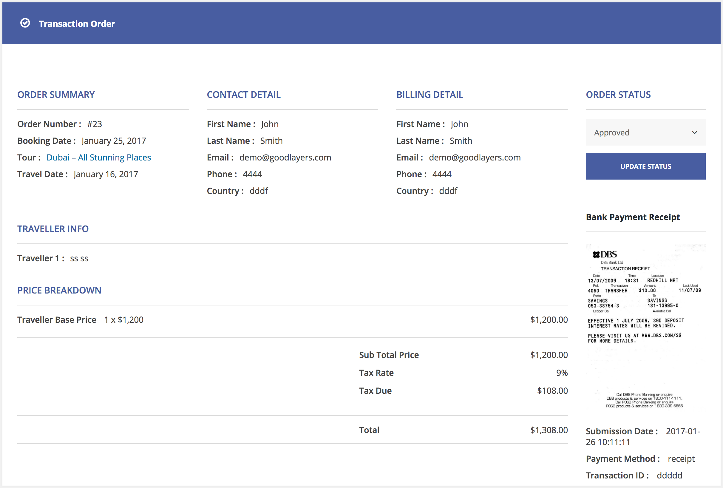 After clicking on the ‘Book and pay later’ button, customer will be able to see the transaction in the backend. There’re two buttons, Submit Payment Receipt and Make An Online Payment.
